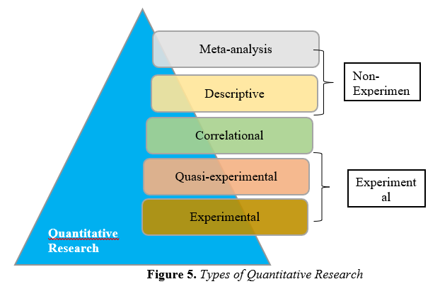 Figure 5 shows the types of quantitative research methods. Descriptive Research: Aims to explain phenomena through the collection, organization, presentation and interpretation of data. Experimental Research: Aims to manipulate the interaction between independent and dependent variables to determine causal relationships. Correlational Research: Aims to evaluate relationships between variables but does not establish a causal relationship. Quasi-Experimental Research: Rather than providing all the controls of experimental research, it is conducted with a slightly looser level of control, so it is a transitional type between correlational and experimental research. Quantitative research is a way to test objective theories by examining the relationship between variables. Meta-analysis is a statistical method that aims to bring together the results of similar studies in a research field and reach more reliable results. These variables, in turn, can typically be measured, usually on instruments, so that numerical data can be analyzed using statistical procedures. The final written report has a specific structure consisting of introduction, literature and theory, methods, results, and discussion sections.