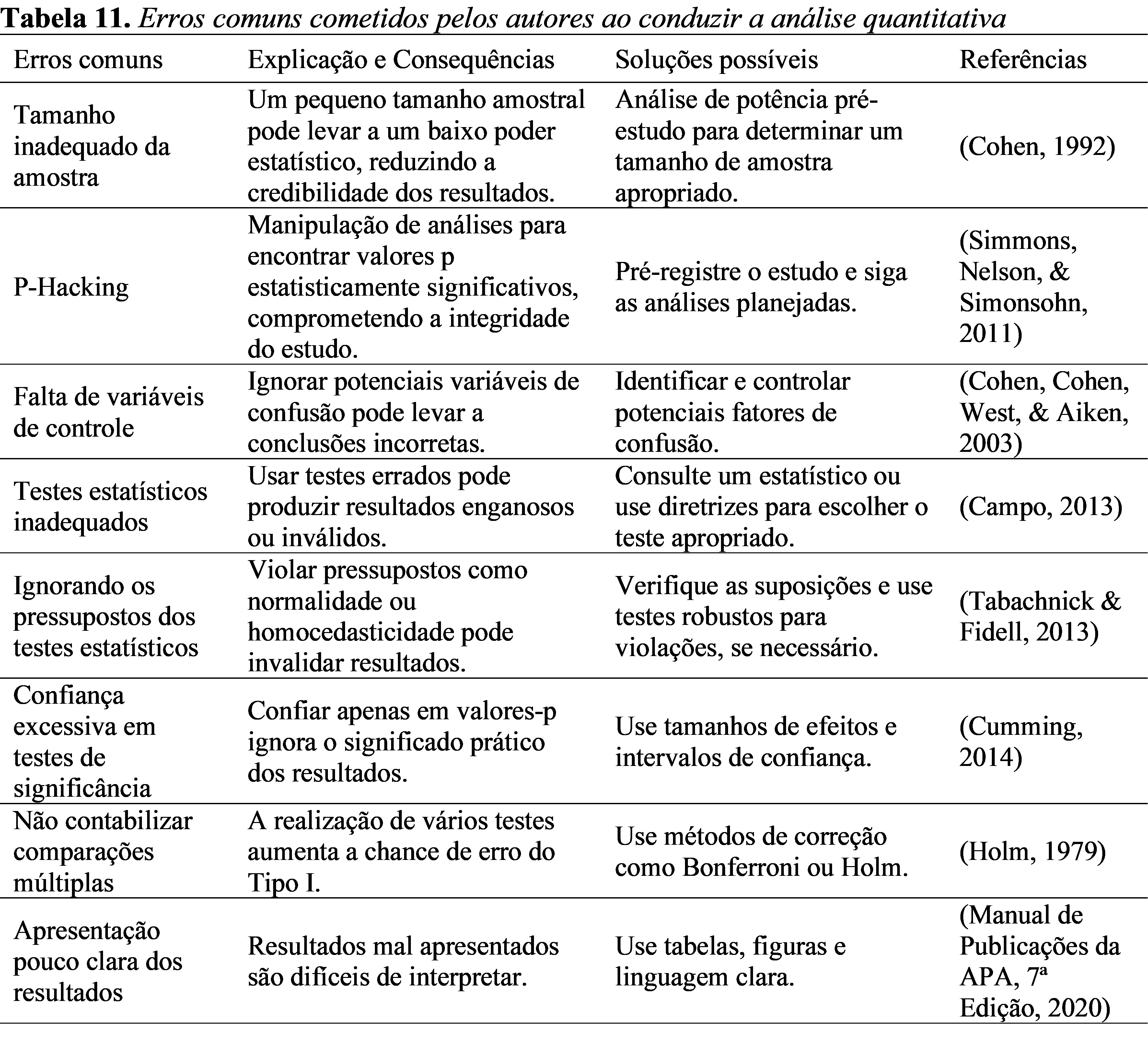 A Tabela 11 descreve erros comuns cometidos durante a investigação quantitativa e as suas causas, consequências e possíveis soluções. Exemplos destes erros incluem o tamanho da amostra insuficiente, o p-hacking, a falta de variáveis ​​de controlo, os testes estatísticos inadequados, ignorando as suposições de testes estatísticos, a dependência excessiva em testes de significância, ignorando as comparações múltiplas e a apresentação não clara dos resultados. Por exemplo, o tamanho da amostra insuficiente pode resultar em baixo poder estatístico e reduzir a credibilidade dos resultados. Para resolver esta situação, pode ser realizada uma análise de tamanho de amostra com antecedência. A manipulação dos valores de p pode comprometer a integridade do estudo, pelo que o estudo pode ter de ser registado antecipadamente e aderir às análises planeadas.