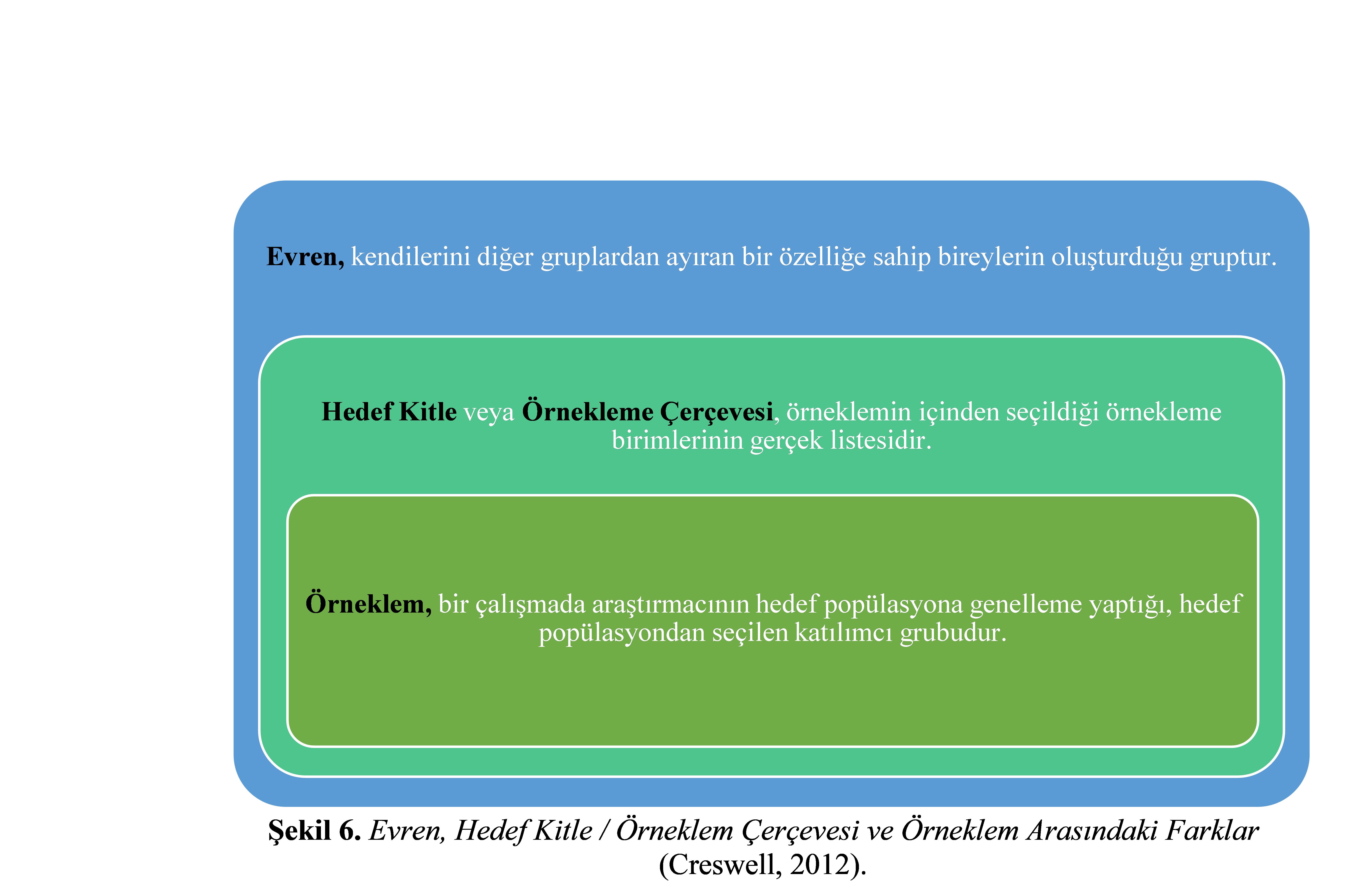 Bilimsel araştırmalarda evren, örneklem, çalışma grubu veya katılımcı gibi terimler; üzerinde araştırma yapılan kişi, durum, düşünce veya nesneleri ifade eder. Yapılacak çalışmanın türüne, üzerinde çalışacağınız popülasyona ulaşma kabiliyetinize ve ulaşmak istediğiniz sonuca bağlı olarak popülasyonun türü ve büyüklüğü değişebilir. Bu nedenle, evreni tanımlamak ve örneklem büyüklüğünü belirlemek, genellenebilirlik ve geçerlilik için çok önemlidir (Cohen, Manion ve Morrison, 2013). Örneğin, nicel bir çalışmada evren, çeşitli disiplinlerden ve kariyer seviyelerinden akademisyenleri içerebilirken, nitel bir çalışmada araştırmacı, mevcut araştırma konusuyla ilgili düşüncelerinden ve özel deneyimlerinden daha derin bilgi edinmek için yalnızca bir akademisyenle çalışabilir. Ayrıca, nitel çalışmalarda araştırmacılar çalışmalarına “katılımcıları” dikkate almalı ve katılımcıların temel özelliklerini, düşüncelerini, bakış açılarını göz önünde bulundurmalıdır. Öte yandan, evren, hedef kitle ve örneklem terimleri farklı özelliklere sahiptir. Şekil 6'da Creswell'in bunlara ilişkin sınıflandırması verilmiştir.